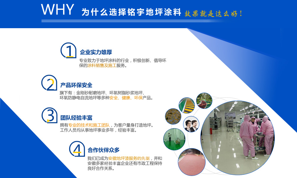 安徽銘宇建材科技有限公司是一家致力于地坪涂料的行業(yè),旗下有金剛砂耐磨地坪,環(huán)氧樹脂砂漿地坪,環(huán)氧防靜電自流地坪,停車場防滑地坪,混凝土密封固化劑和丙烯酸球場,無震動止滑車道、塑膠跑道、工廠地板漆等工程施工服務。  憑借本身的技術能力和研發(fā)條件,加上多年對環(huán)氧地坪和耐磨硬化地坪等各類工業(yè)地坪的涂裝、施工的實踐經驗、技術己處于國內專業(yè)水平,經檢測機構檢驗符合相應的技術標準。同時安徽銘宇建材科技有限公司還組建了經驗豐富的工程技術隊伍以及工程施工隊伍、簡歷了完善的售后施工服務體系,滿足用戶的需要。   安徽銘宇建材科技有限公司是一家積極創(chuàng)新、倡導環(huán)保的涂料銷售及施工服務的廠家,安徽銘宇建材科技有限...